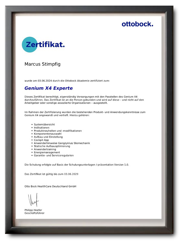 Mit Stolz verkünden wir, dass wir nun offiziell als Genium X4 Experten von Ottobock zertifiziert sind! Dies markiert einen weiteren Meilenstein auf unserem Weg, Spitzenleistungen in der technischen Orthopädie zu erbringen.